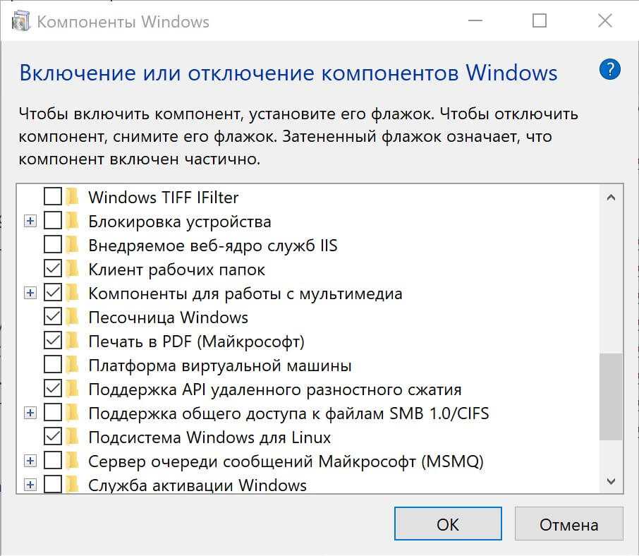 Найдите в списке пункт «Песочница Windows» и поставьте напротив него галочку.