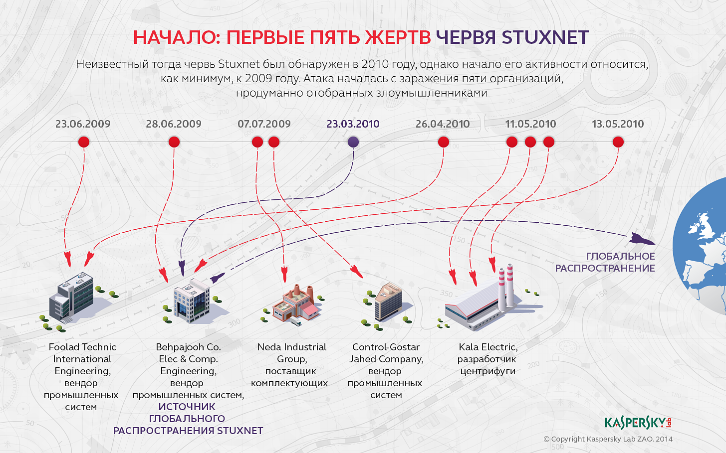 В коде специалисты нашли следы программы уязвимости «нулевого дня», явно написанной профессионалами. Появились версии , что Stuxnet был запущен с конкретной целью — атаковать блоки управления газовыми центрифугами для получения обогащенного урана на стратегических объектах. Именно заводы, которые их выпускали, стали еще одной мишенью вредоносного ПО. Злоумышленники рассчитывали, что от них вирус распространится на заводы по производству обогащенного урана в Иране, чтобы нанести удар по всему ядерному проекту. Их план сработал.
