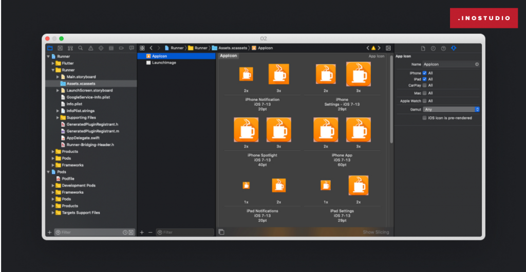 Для смены иконки iOS-приложения нужно открыть Runner.xcworkspace в папке «ios» Flutter-проекта, найти в структуре проекта Assets.xcassets и разыскать AppIcon image set. Скорее всего, asset уже будет создан Flutter’ом, но в крайнем случае его придется добавлять вручную через контекстное меню. Далее выбрать поддерживаемые устройства из списка Attributes Inspector’а (последняя вкладка правой панели) и, ориентируясь по размерам в поинтах и коэффициентам масштаба под каждой иконкой, перетащить файлы-исходники в asset. Шпаргалку с полным перечнем необходимых размеров можно найти тут.