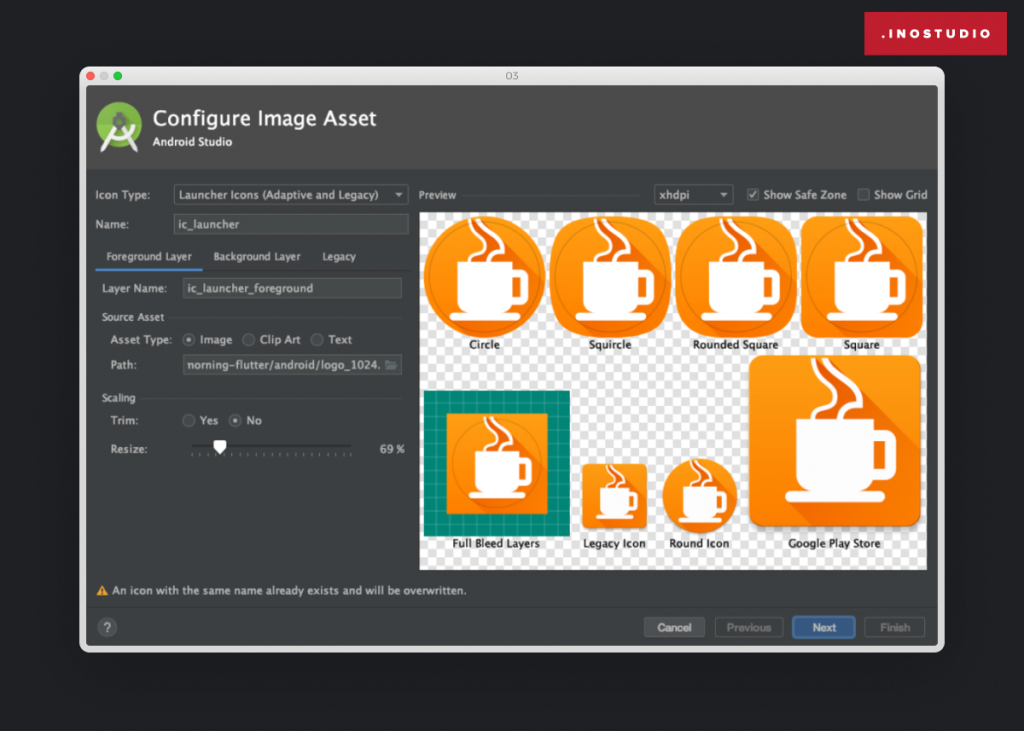 Для тех, кого не смущает количество импортированных в проект сторонних библиотек, существует и альтернативный вариант: flutter_launcher_icons. Добавляем либу в pubspec.yaml, там же указываем путь к исходнику иконки, а также прописываем, для каких платформ нужно масштабировать изображение: