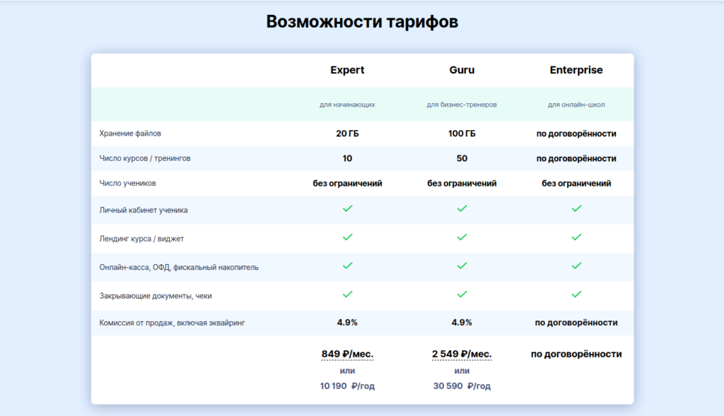 Подходит для тех, кто впервые создает онлайн-продукт: платите вы только за те курсы, которые продаете. Тариф «Профи» стоит от 990 рублей в месяц, при этом можно запустить от 1 до 10 курсов (актуально на апрель 2021 г. – прим.ред.).