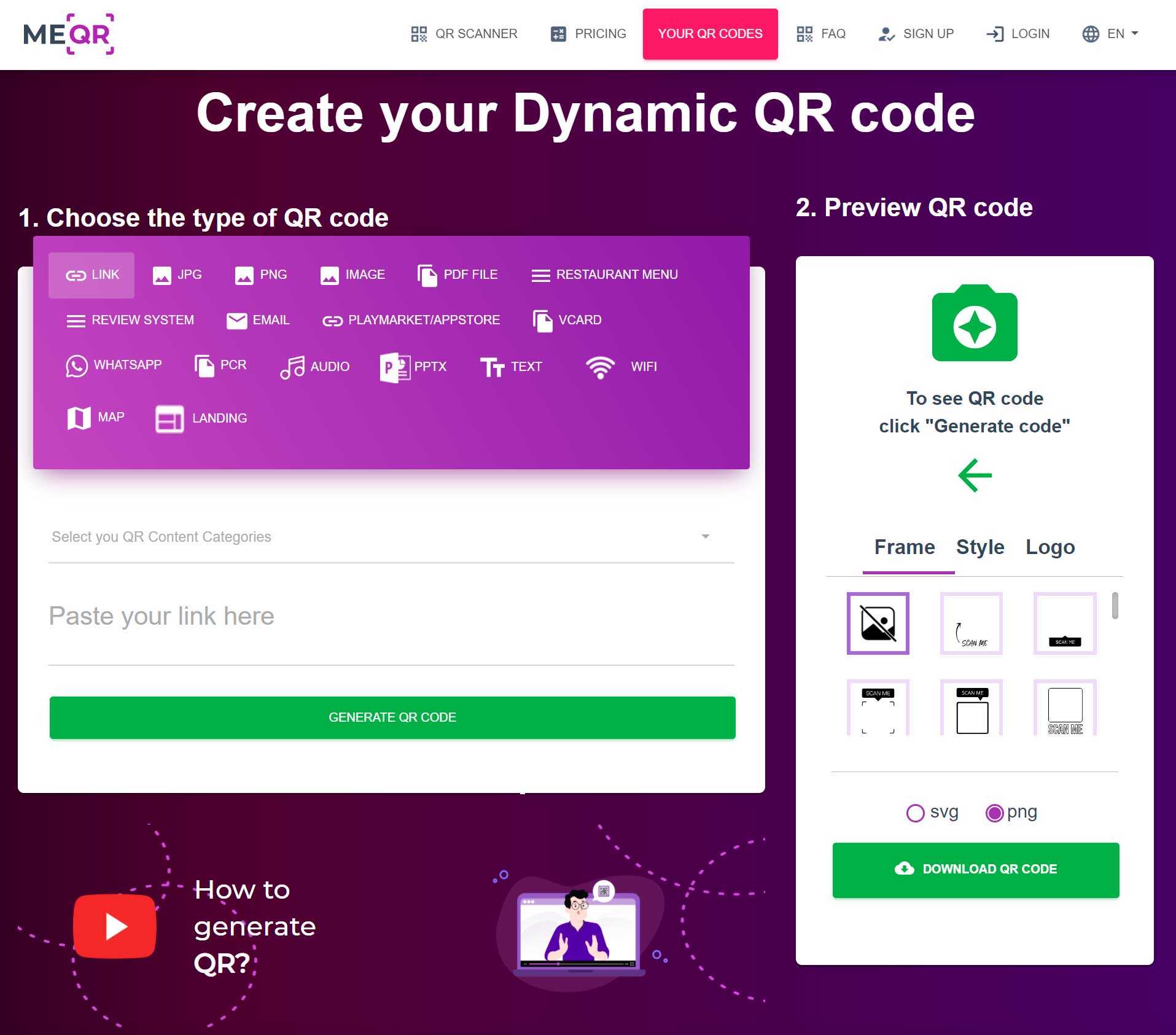 Можно делать, как статические, так и динамические QR. Все варианты вынесены в свои разделы, чтобы пользователю было удобнее ориентироваться на сайте.