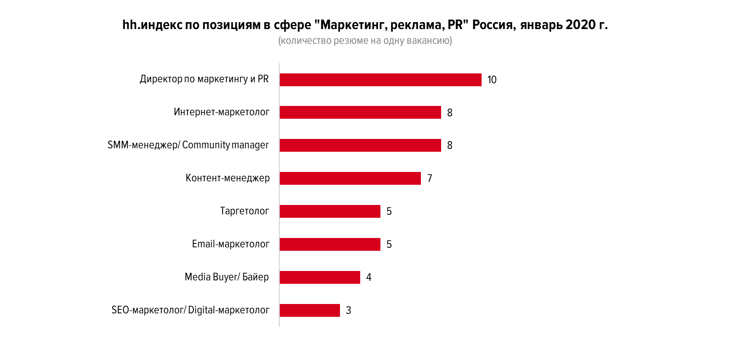 Для позиции директора по маркетингу и PR уровень конкуренции в два раз выше — в среднем 10 резюме на одну вакансию. Уровень конкуренции у интернет-маркетологов и SMM-менеджеров — по 8 резюме на одну вакансию, контент-менеджеров — по 7.