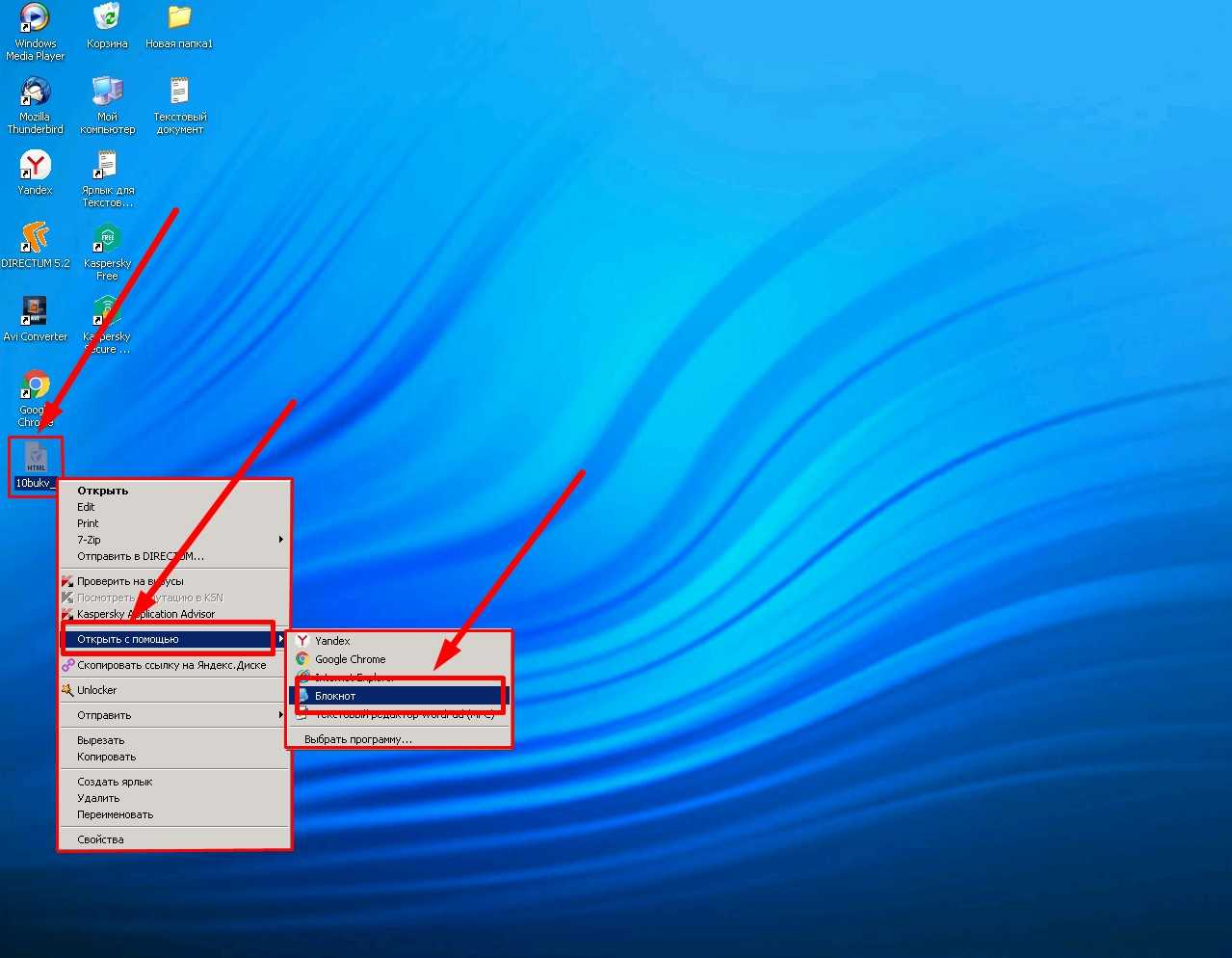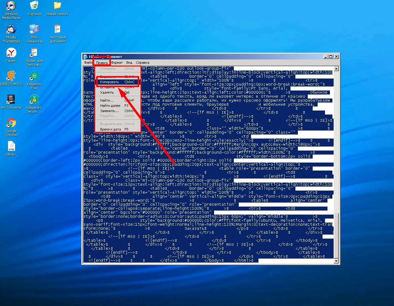 Ещё момент. Далее нам понадобится содержимое нашего html-письма в виде html-кода. Чтобы добраться до этого содержимого, откроем файл с нашим письмом, имеющий расширение .html, при помощи стандартного «Блокнота» из Windows. Используем правый клик и контекстное меню.