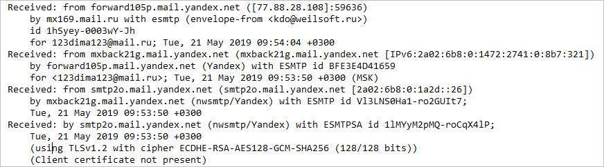 В итоге на отправляемый ящик электронной почты должно прийти письмо от нашего адреса с доменом yandex.ru. Если посмотреть в заголовки, оно должно было быть отправлено через серверы Яндекса: