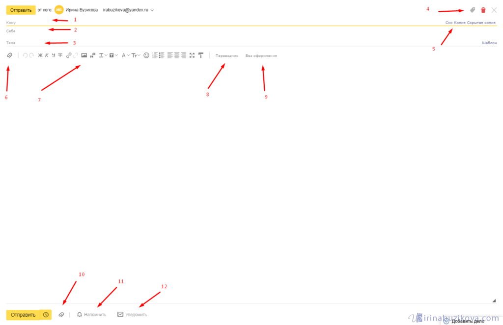После того, как письмо готово — впишите почту получателя, тему письма и отправляйте!