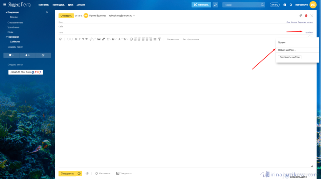 Еще правее находится кнопка шаблон – возможность создать шаблон письма, сохранить и при необходимости отправлять готовое письмо.