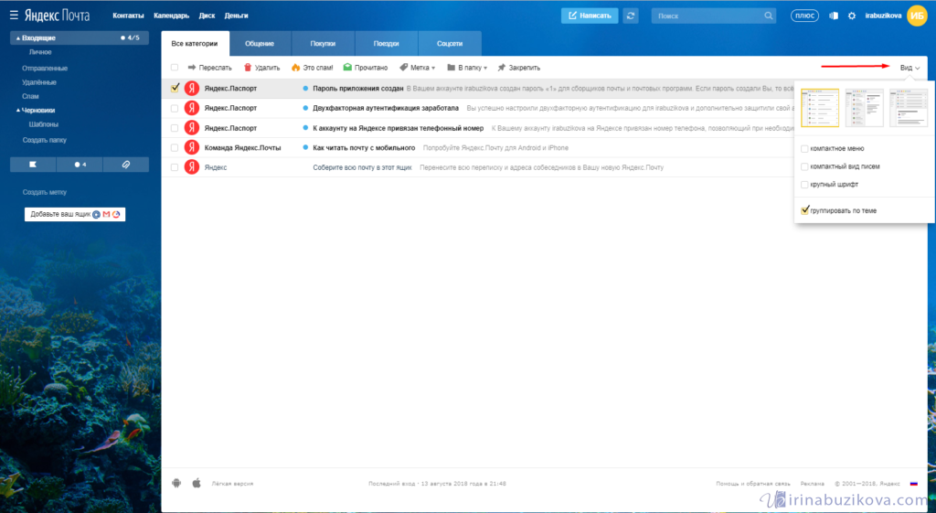 Справа находится кнопка Вид – эта кнопка отвечает за внешний вид почтового ящика, доступны три варианта отображения: