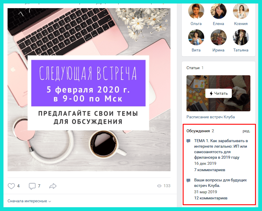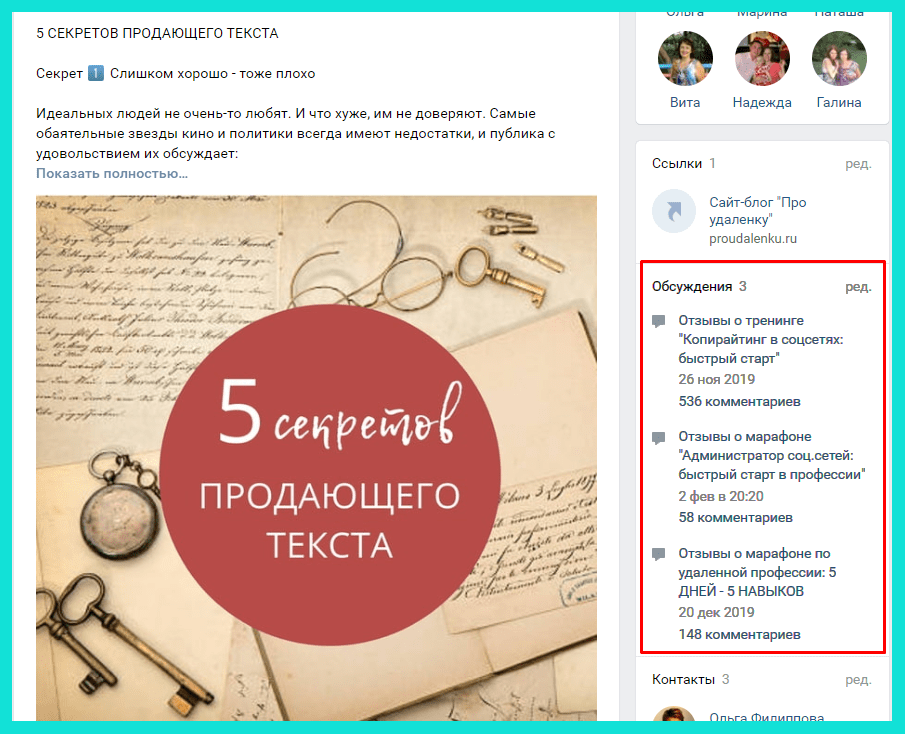 Вывод 4. Для большинства бизнесов самое удачное место для раздела Обсуждения – справа снизу. В паблике он находится там по умолчанию. Для группы придется применить хитрые методы.