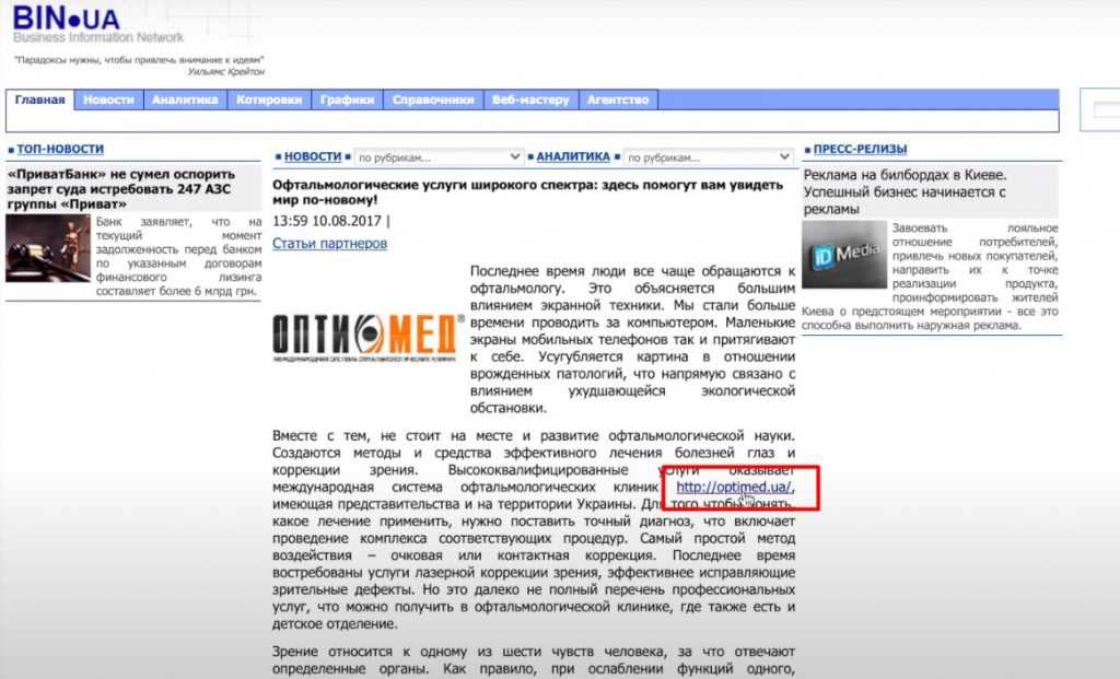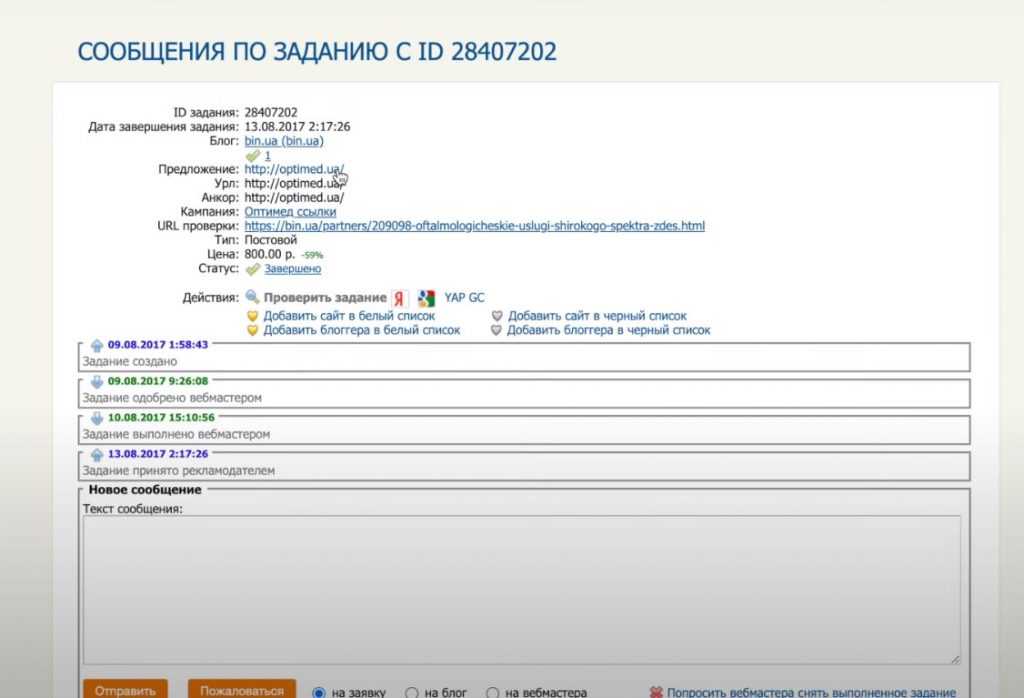 Расскажу, как это выглядит внутри. Есть ID по каждой сделке, это которые уже совершены. То есть, я в данный момент покупал для сайта optimed.ua ссылочку на сайте bin.ua. Можно зайти на сайт и проверить статью и в ней есть активная ссылочка. Ну собственно владелец сайта bin.ua заработал 800 рублей + биржа взяла комиссию.