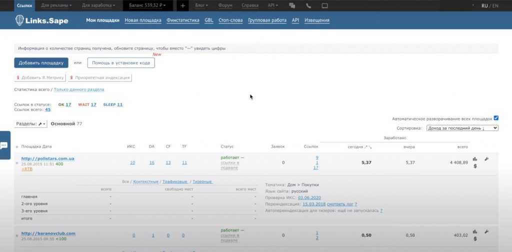 Сейчас покажу как это реализовано у меня. Сам кабинет в Sape внутри выглядит вот таким образом. Есть список сайтов, их характеристики, сколько ссылок продается и сколько в день они дают. И это может быть небольшая сумма и это те сайты, которые знаете уже миллионы лет существуют, и они уже мне не нужны, а просто висят.