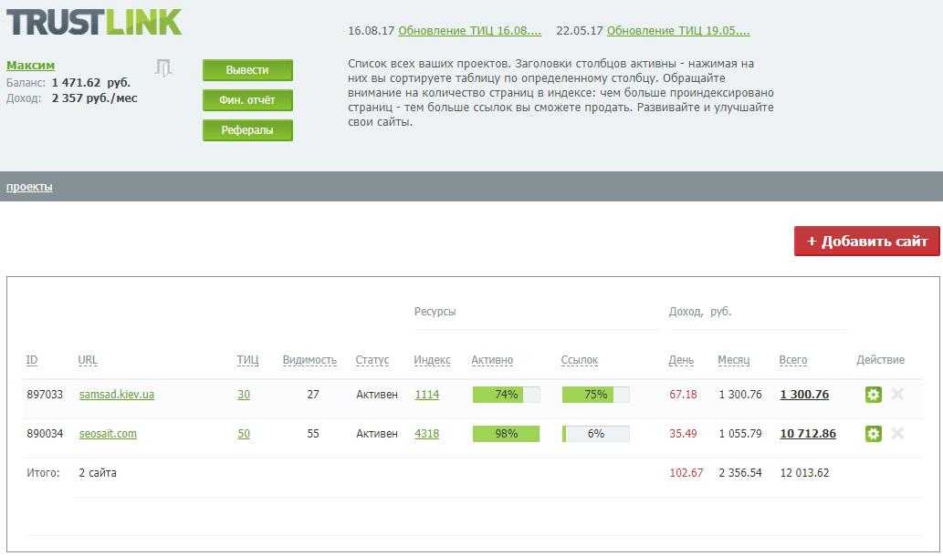 Каждому веб-мастеру и оптимизатору предоставляется новая и актуальная информация о проданных и купленных ссылках, их стоимости и текущем финансовом состоянии пользователя биржи.