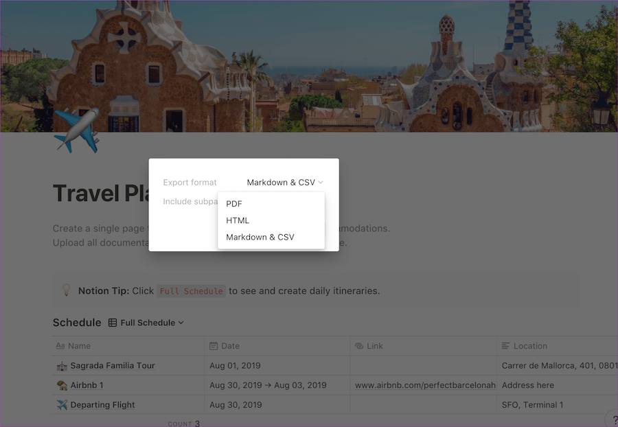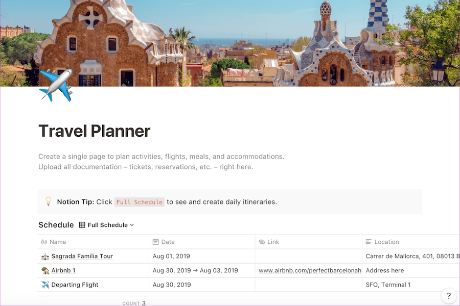 Так выглядит шаблон для планирования путешествий