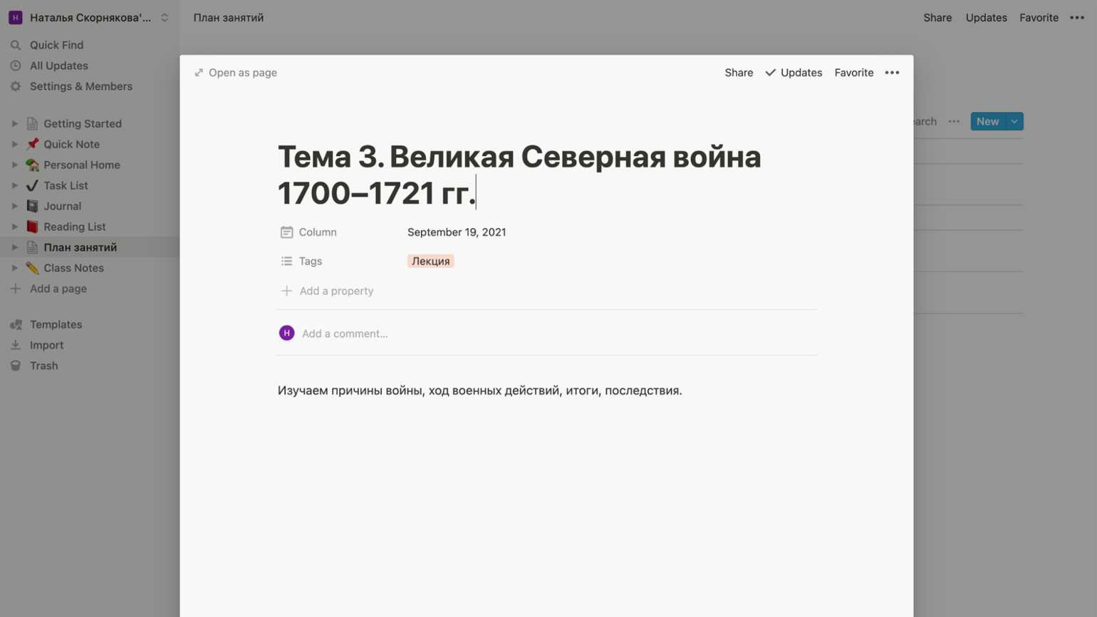Вложенная страница из базы данных. Скриншот: веб-версия Notion