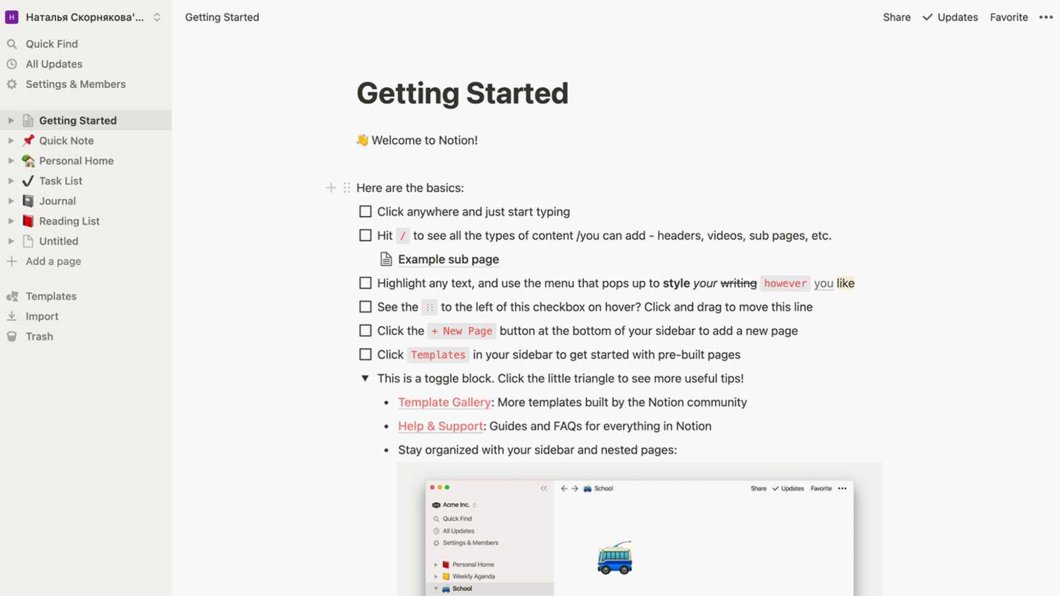 После регистрации вы попадёте на стартовую страницу — это рабочее пространство. Создатели стараются объяснять все существующие функции внутри самого приложения, поэтому на стартовой странице вы увидите перечень базовых действий, подсказки для начала работы, шаблоны для разных видов страниц, а также обучающие видеоролики. Их все можно найти также на YouTube-канале Notion.