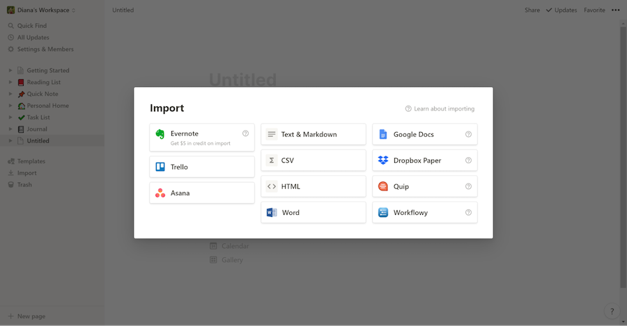 Окошко импорта из сторонних сервисов в Notion