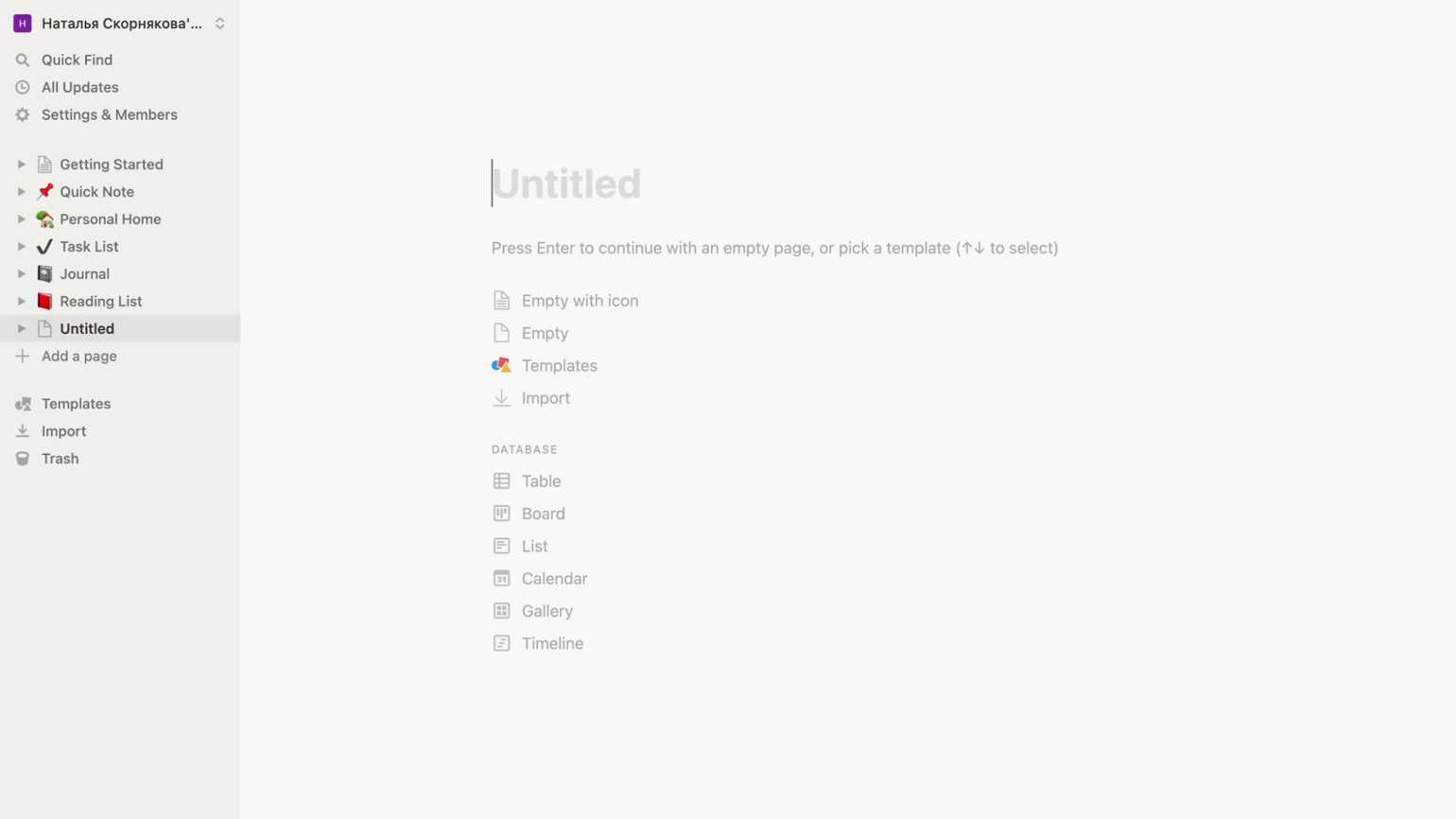 Создание новой страницы. Скриншот: веб-версия Notion