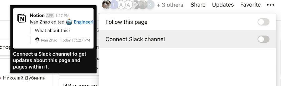 Приложение можно «объединить» с групповым чатом в Slack, чтобы вы могли обсуждать все изменения в проекте, обмениваясь данными и файлами из Notion. Для этого нажмите Updates в верхнем правом углу приложения и Connect Slack Channel в выпадающем меню.
