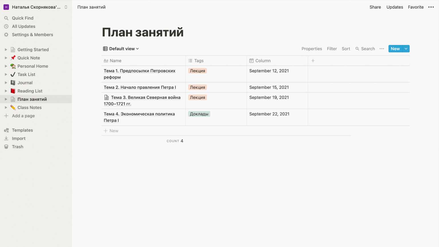 Пример простой таблицы — базы данных. Скриншот: веб-версия Notion