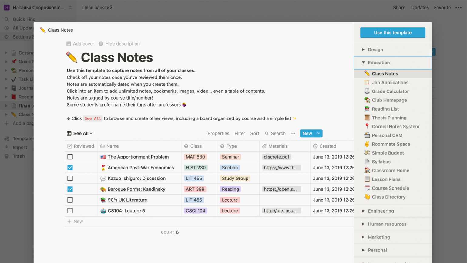 Стандартный набор шаблонов, разбитый на категории. Скриншот: веб-версия Notion