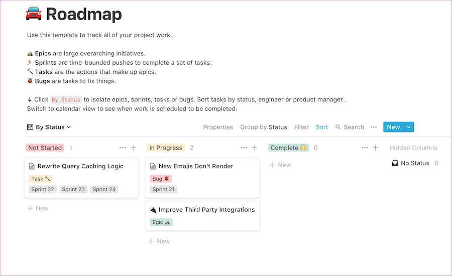 В Notion вы можете использовать шаблон Roadmap, чтобы пользоваться теми же функциями, что и в Trello.