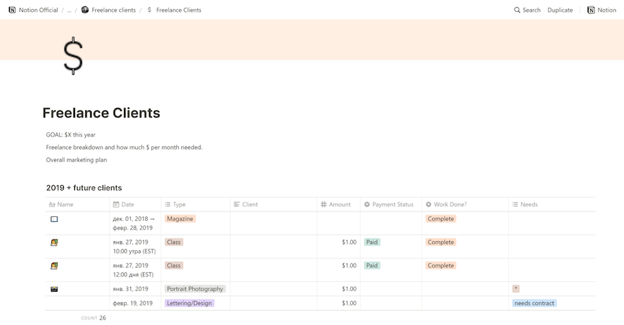 Так выглядит шаблон Notion для фрилансеров