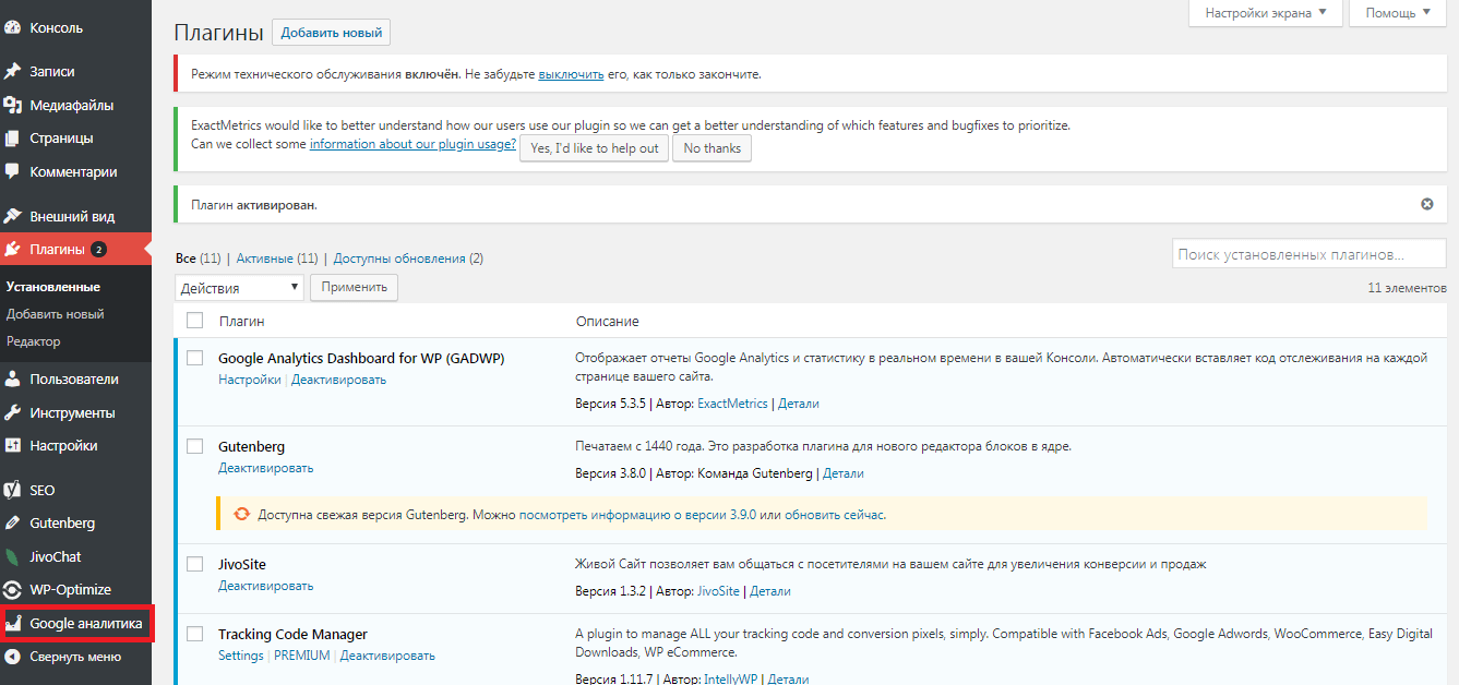 Скачать плагин можно на официальном сайте разработчика или найти в каталоге плагинов админ-панели сайта. Чтобы установить модуль из каталога, кликните по кнопке «Установить», а затем — по кнопке «Активировать». В левом меню появится раздел «Google Аналитика».
