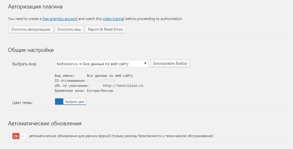Позволяет просматривать статистику сайта от Google Analytics и управлять ей в административной панели WordPress.Плагин поддерживает основные функции Google Analytics: