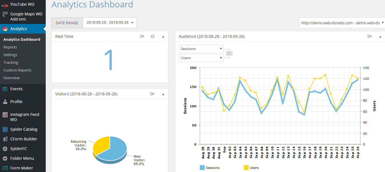 Платный плагин Гугл Аналитики для Вордпресс. Разработан компанией WebDorado. Совместим с CMS версий от 3.9 до 4.9.8.