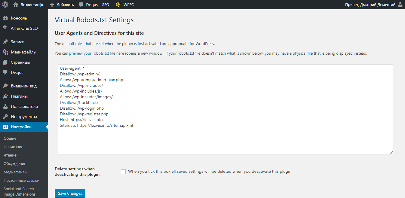 Плагин создает файл Robots.txt и позволяет редактировать его в админке WordPress. Используйте, если не устанавливаете комбайны типа All in One SEO Pack.