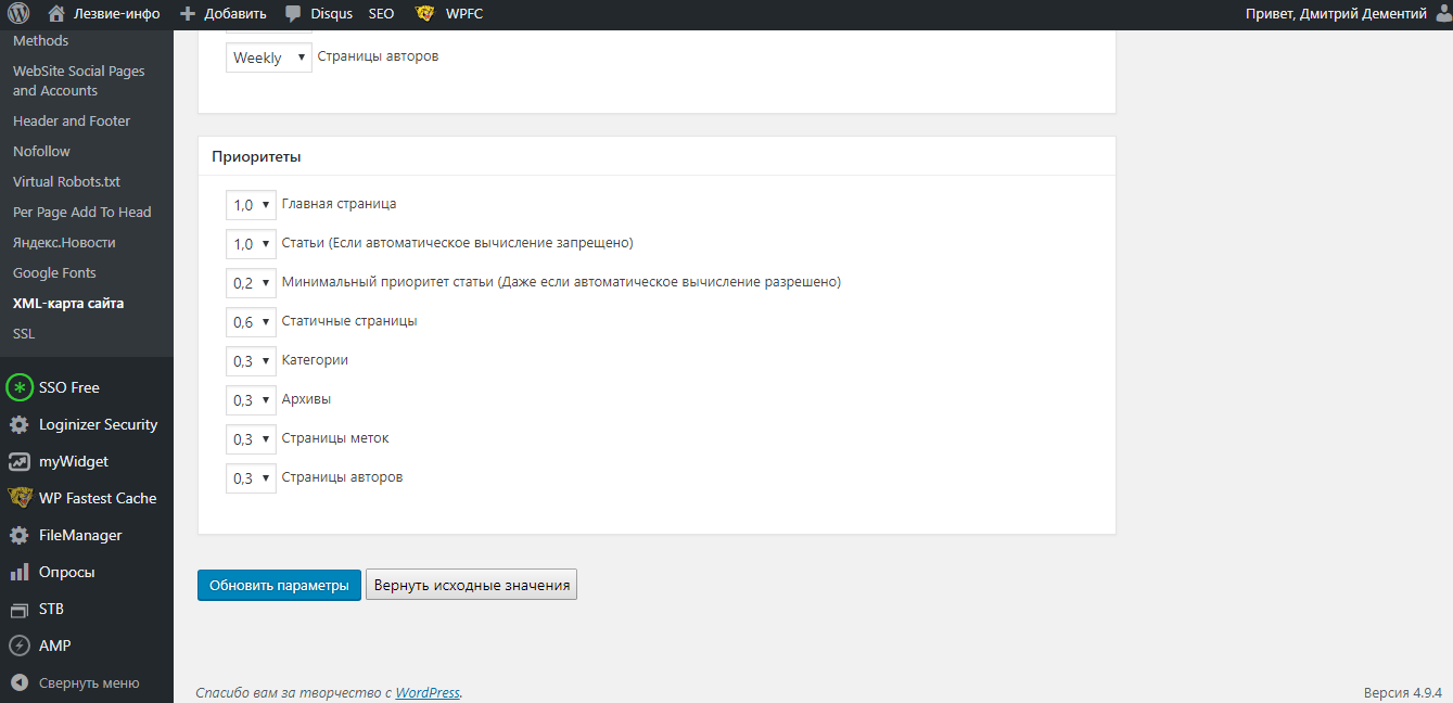 Настройки приоритетов индексирования в интерфейсе Google XML Sitemaps