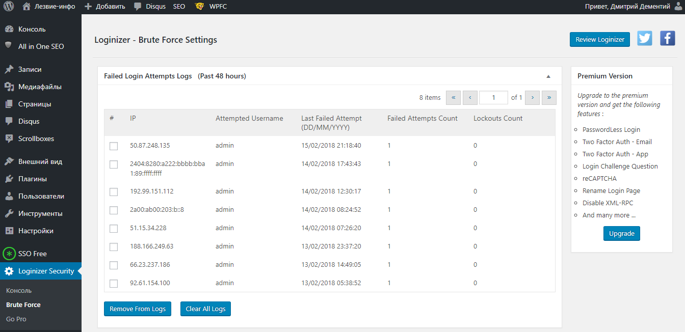 Плагин из категории must have. Защищает сайт от брутфорсинга или взлома методом перебора паролей. Блокирует IP-адрес злоумышленника после нескольких неудачных попыток входа.