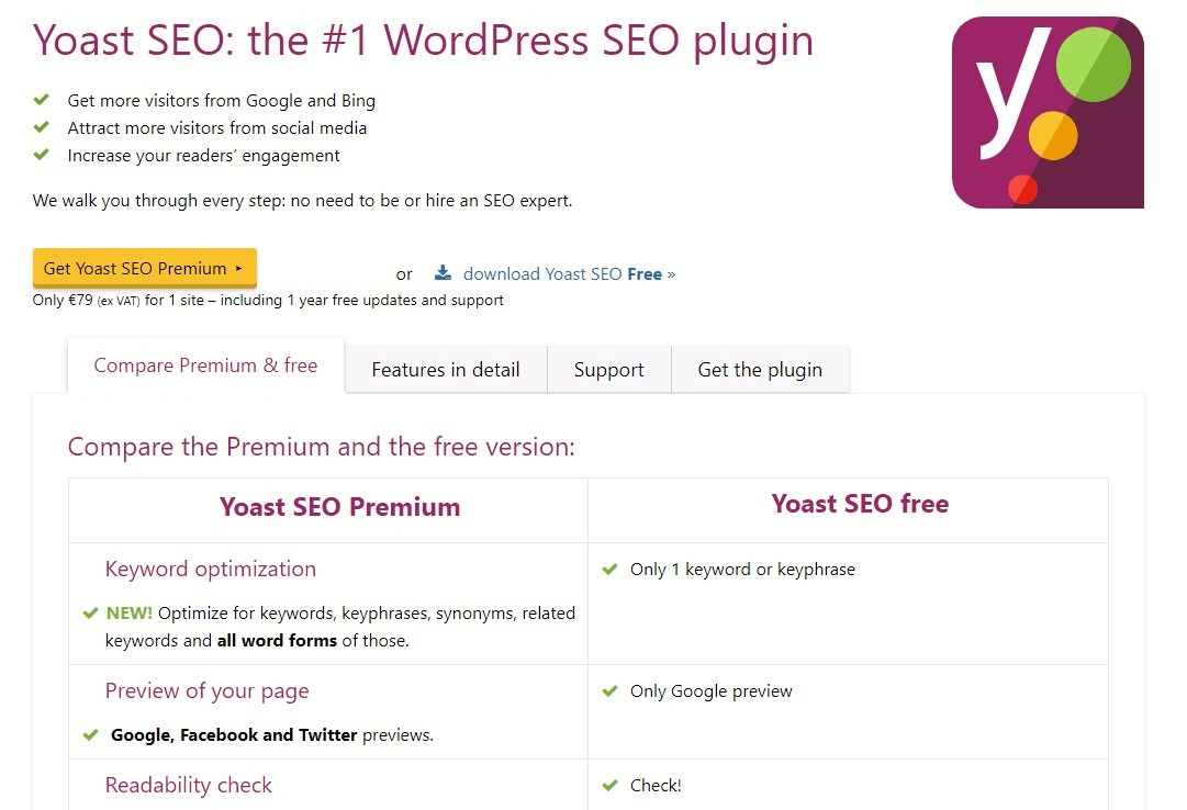Например, популярный SEO-плагин – Yoast SEO с бесплатной и платной версиями: