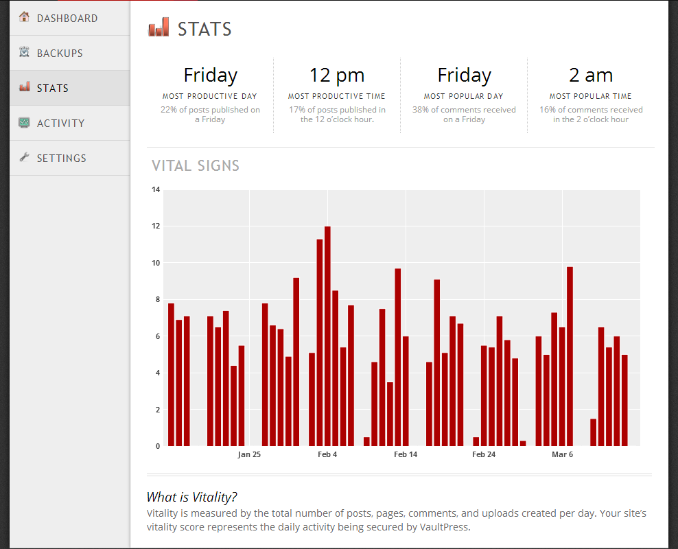 VaultPress без труда создает резервные копии всех записей, комментариев, файлов мультимедиа, изменений и настроек на вашем сайте и хранит копии на своих серверах.