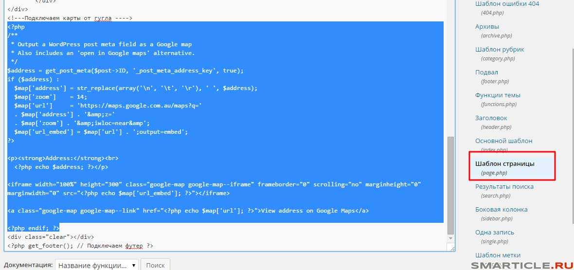 Если вы уже разбираетесь в вордпрессе, то можете задать вопрос «Зачем добавлять этот код? Ведь он будет выводится на всех страницах без исключения». Нет, отвечу почему. Дело в том, что добавлять карты гугл таким образом мы будем через произвольные поля. Если мы ничего не укажем, то ничего выводиться не будет и об этом можете не беспокоиться. Итак, в шаблон страницы код карты мы вставили, теперь давайте выведем его на любой странице без добавления скрипта. Для этого я снова перехожу в раздел «Контакты» и удаляю уже имеющийся там код.