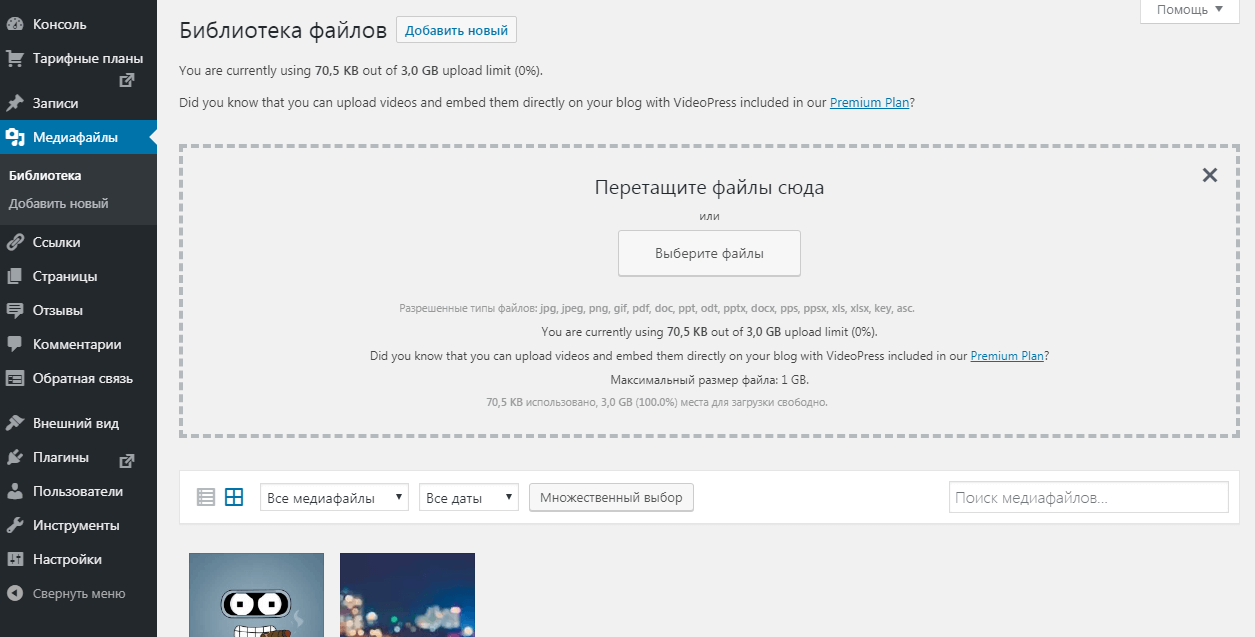 Как правило, ни один пост не обходится без сопутствующих изображений, фотографий, скриншотов. Во-первых, медиафайлы позволяют разбавить «сухой» текст. Читать его становится проще и интереснее. Во-вторых, изображения и видео позволяют бороться за выдачу «Яндекса» и Google в соответствующих разделах поиска. Любое изображение, которое вы хотите добавить в свой пост, должно быть предварительно загружено в базу данных вашего сайта. Сделать это можно в разделе «Медиафайлы».