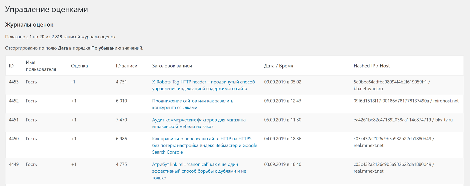 На мой взгляд, это лучший плагин, позволяющий реализовать рейтинговую систему. Еще одна фишка – виджет, куда будут выводиться N постов по вашим критериям (лучшая оценка, больше всего оценок и т.д. за выбранный период времени).