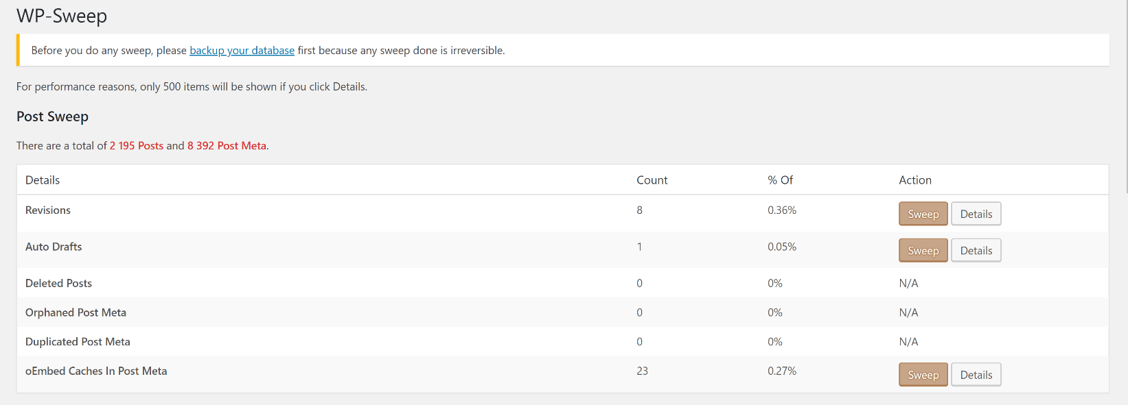 А к чему вся эта история? К тому, что даже после установки ограничений в конфиге и/или удаления плагина, сами ревизии остаются болтаться в базе данных. Я решил поинтересоваться, как их почистить. И нашел решение – плагин WP-Sweep. Кроме очистки ревизий, он может почистить кучу другого мусора в вашей БД. Если вы экспериментируете с плагинами или публикуете много постов, мусора у вас просто гора, поверьте. Лично у меня база данных после чисти уменьшилась вдвое.