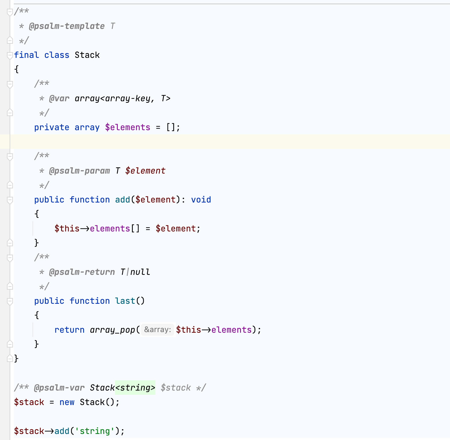 Таким образом, наш стек может хранить как строки, так и числа, объекты и массивы. А чтобы убедиться, что это работает, загляните в редактор псалма.