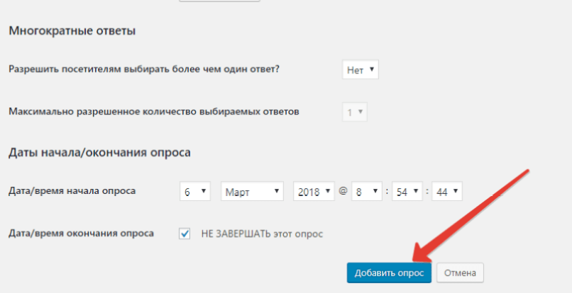 - Если вы хотите сделать опрос временный, то задайте ему время начала, а потом время конца (для этого снимите галочку в поле дата и время окончания» и выставьте нужное вам время).