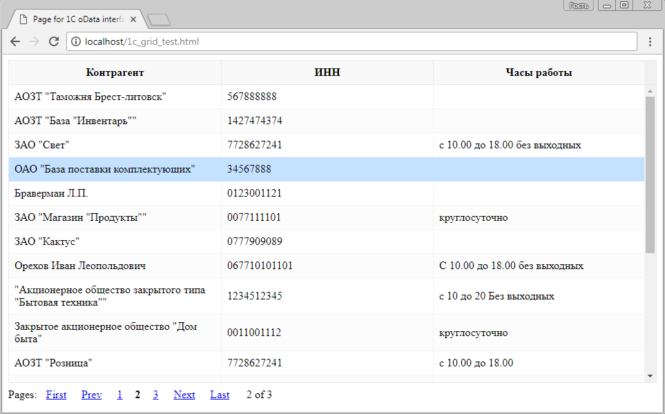 Допустим, что мы не грамотные JS-программисты, но какой-то списочек повесить на сайт хотим. Я открыл статью с перечнем самых популярных на сегодняшний день библиотек создания таблиц и нашел в нем простенькую библиотечку jsGrid как раз для нашего случая. Изучаем их сайт, берем пример их кода по использованию OData и вставляем туда путь к нашим данным.