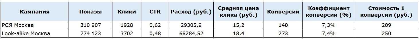 Благодаря списку телефонных номеров пользователей, которые оставляли заявку на трудоустройство, удалось создать сегмент похожей аудитории с высокой степенью соответствия и добиться следующих показателей по сравнению с традиционной РСЯ-кампанией за 3 недели теста (с 20 июня по 11 июля 2017 года).