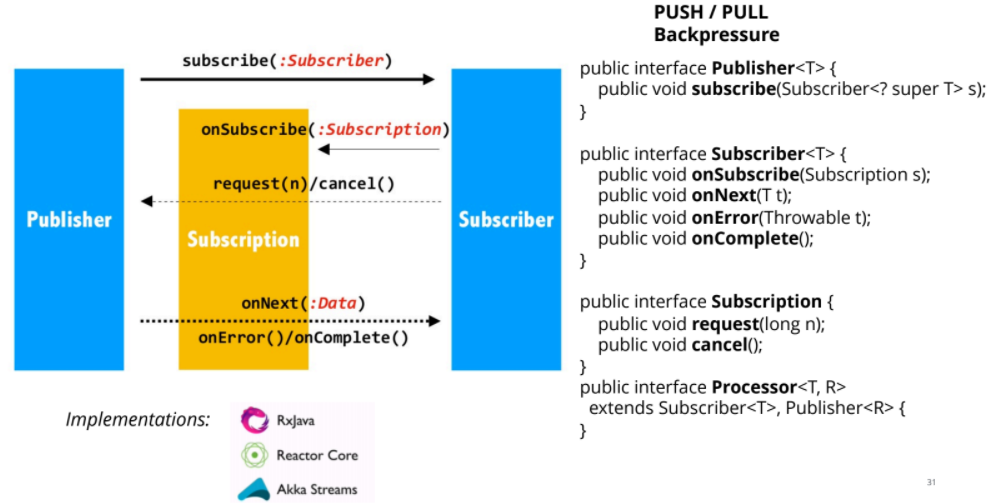 Если предыдущие технологии (Completable Future, Fork/Join framework) получили свою имплементацию в JDK, то реактивные потоки имплементации не имеют. Есть только очень короткая спецификация. Там всего 4 интерфейса: