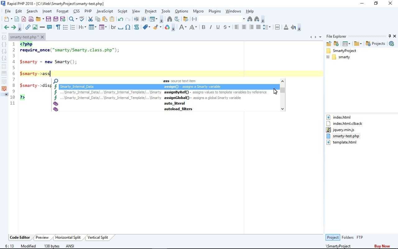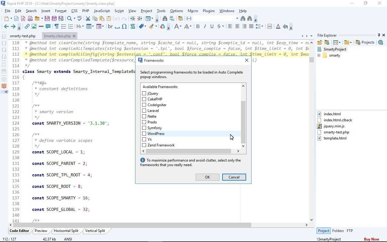 Поддержка фреймворков: встроена поддержка Smarty, а другие библиотеки можно подключать через пункт Frameworks вменю Options.