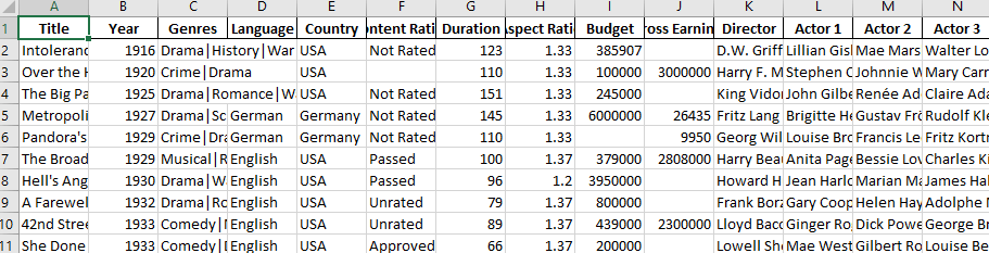 Now that we have read in the movies data set from our Excel file, we can start exploring it using pandas. A pandas DataFrame stores the data in a tabular format, just like the way Excel displays the data in a sheet. Pandas has a lot of built-in methods to explore the DataFrame we created from the Excel file we just read in.