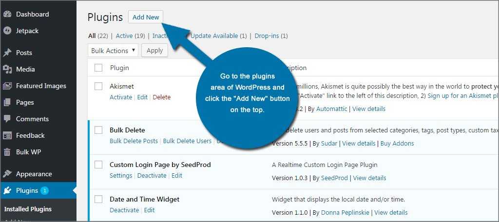 В панели администрирования WordPress перейдите в раздел «Плагины» и нажмите на кнопку добавления нового плагина.