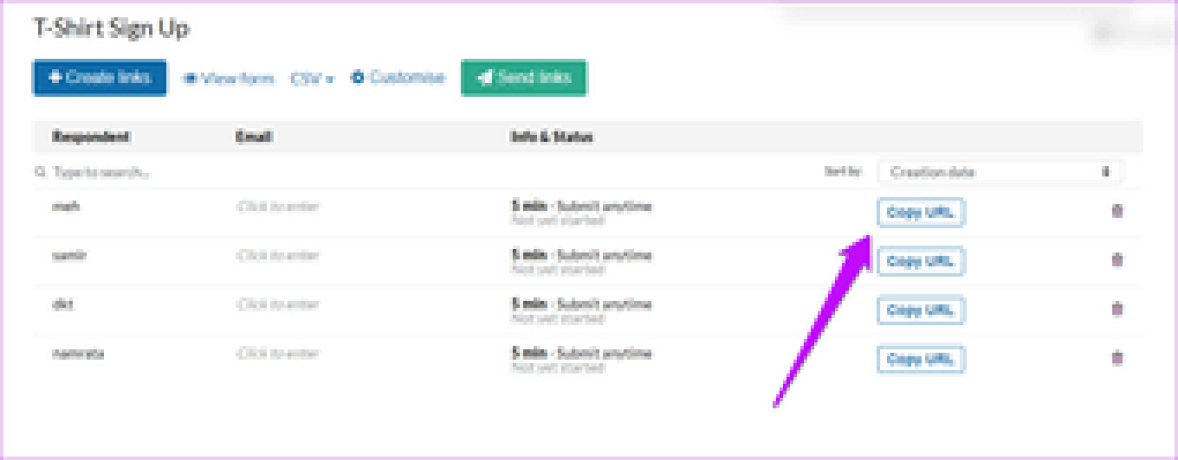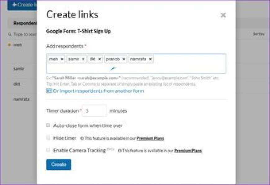 Затем активируйте надстройку, щелкнув значок надстройки. После этого вы увидите новую форму на панели инструментов Timify. Нажмите на название формы> Создать ссылки и введите имена всех ваших учеников, которые будут принимать участие в викторине.