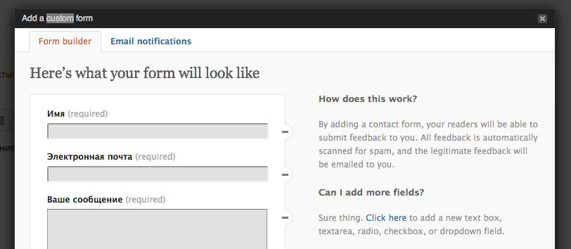 Щёлкнув по этой кнопке, вы перейдёте в режим работы с контактной формой. Если у вас на странице уже есть контактная форма, то в открывшимся окне вы сможете её редактировать. Если на странице контактных форм не было, то Jetpack предложит создать новую форму со стандартными полями.