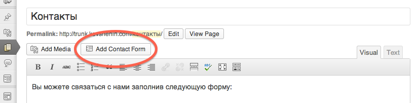 Контактные формы Jetpack можно размещать как в записях, так и на страницах. В качестве примера мы создадим новую страницу и назовём её «Контакты». В редакторе страницы вы заметите новую кнопку для работы с контактными формами: