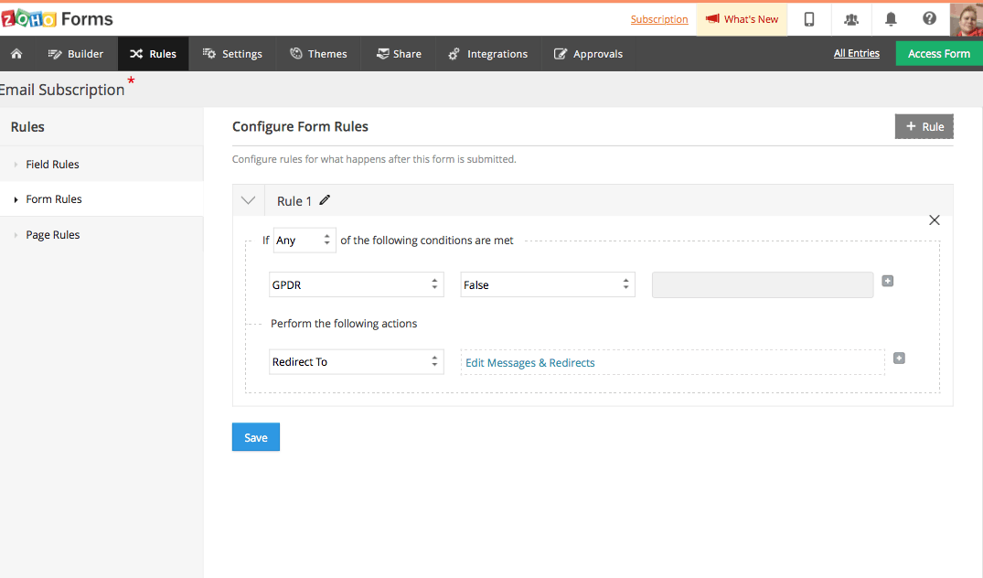 Правила. Zoho Forms позволяет создавать определенные правила полей, форм и страниц. Это позволяет задавать инструкции для форм Zoho для выполнения определенных действий на основе определенных ответов. Например, на скриншоте ниже задано правило формы для формы подписки на электронную рассылку, чтобы пользователи попадали на страницу, объясняющую правила GDPR, если они не устанавливают флажок согласия с GDPR.